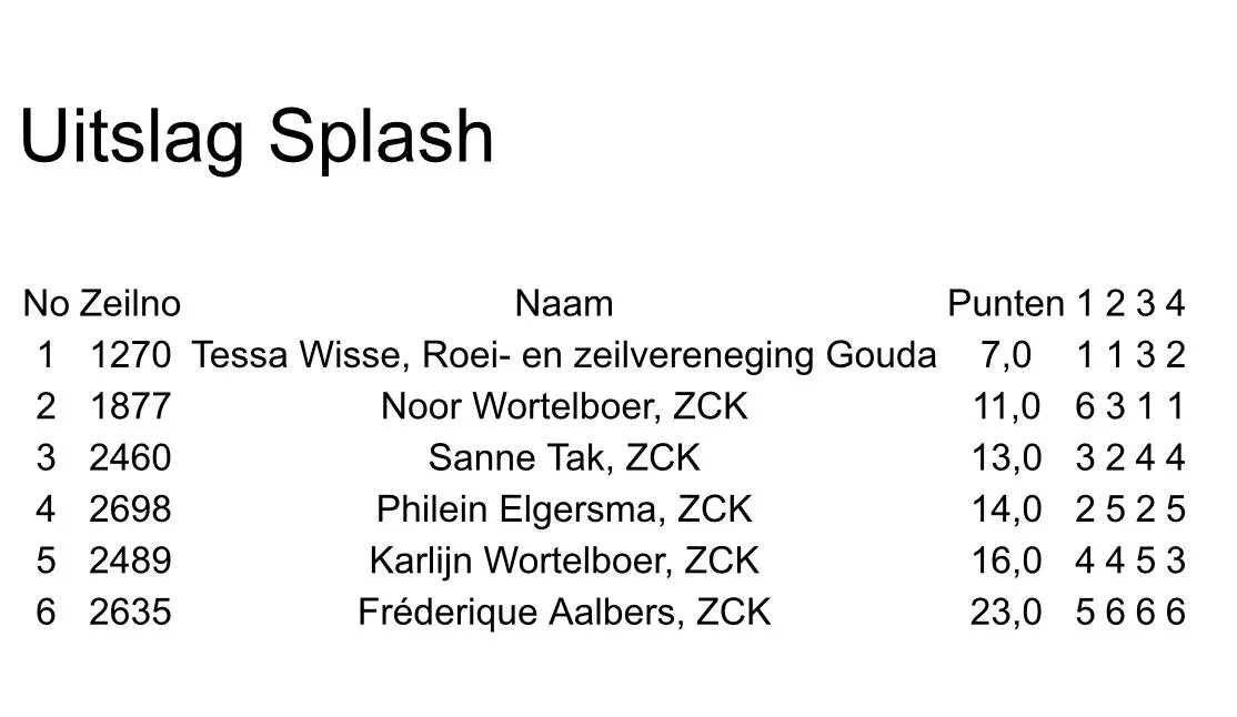 Viel dat even mee! Aanmeldingen van diverse verenigingen uit de combi en een nieuwe lichting eigen ZCK-leden. Die laatsen veelal voor het eerst deelnemend aan een officiële wedstrijd. Na de briefing door ZCK-voorzitter Gerd Jan Poortman gingen de vier groepen en bijboten het water op. De Laser 4.7 en Splash piloten waren als eerste aan de beurt. De Splash kent een ware opleving bij ZCK en sommige boten waren letterlijk 2 dagen eerder aangekocht. De beide klassen maakten het zowel elkaar als elkaars klassen nog knap lastig en lagen soms zo dicht bij elkaar dat het voordewindse rak gebruikt werd om kennis te maken tussen de clubs en bij te praten. Ook dat is de combi! Tessa Wisse (NED 1270) van RZV Gouda pakte de winst na 4 wedstrijdjes in haar opvallende gele Splash Marsupulami. Noor Wortelboer (NED 1877) van ZCK werd knap tweede in haar eerste seizoen met een net verworven Splash. Zij pakte na de twee eerste overwinningen van Tessa de laatste twee. Het brons ging naar Sanne Tak (NED 2460) van ZCK. De beide Laser 4.7 dames hadden nog een spannende strijd met het Splash-veld. Anneroos van den Biggelaar in een mooie Laser NED 193877 die nog op de Olympische Spelen in Bejing (2008) had rondgevaren pakte 4x de eerst plek voor Sacha Lampe. Beiden zijn van KRZV De Maas.