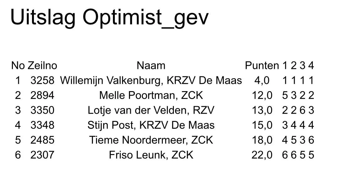 De zeilers in de Optimisten Groen klasse, met fier wapperende groene lintjes, gingen als laatste van start als grootste groep met 10 boten. Zij voeren een driehoeksbaan. Velen met amper tot weinig zeilervaring. Op de Kurenpolder is het altijd afwachten hoe de wind staat en de baan erbij ligt maar zij vonden hun weg. Met een voorzeil-boot en coach boot achter werden de jongsten op koers gehouden en beleefden zij een prima eerste tourbeurt. Thijmen Kremers (NED 2688) van RZVG had een keurige winning streak met vier 1e plekken en dus dagwinnaar. Ook hier was het erachter knap spannend en eindigden er twee met gelijk aantal punten (8). In zo’n situatie telt de laatste start en dus werd Cas Mulderij (NED 3201) van KRZV De Maas tweede voor Julian van Hoving (NED 2420) van RZV.